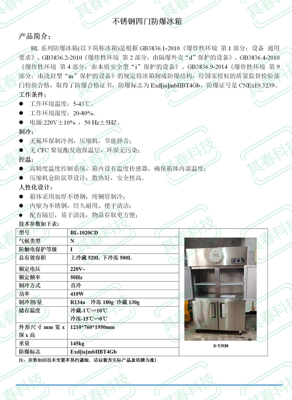 冷藏冷凍防爆四門冰箱不鏽鋼定做BL-1020CD